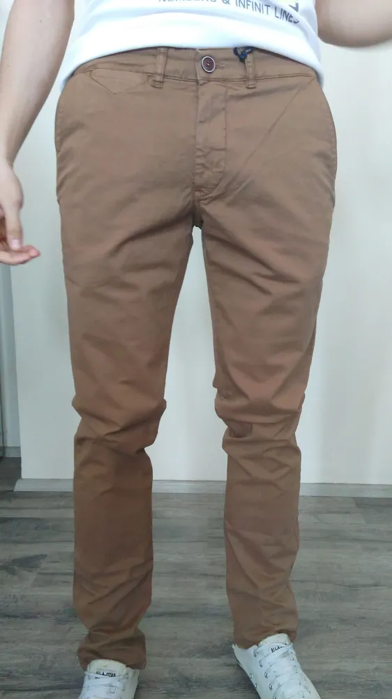 Pánske nohavice hnedej farby. Vzadu dve vrecká.