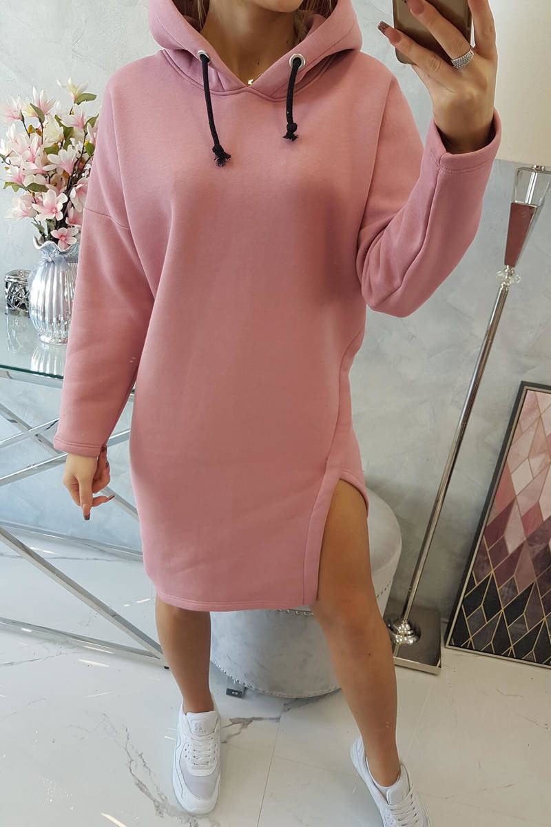 Pohodlné mikinové šaty s kapucňou a vreckami. Šaty majú dlhší chrbát a bočný rozparok.