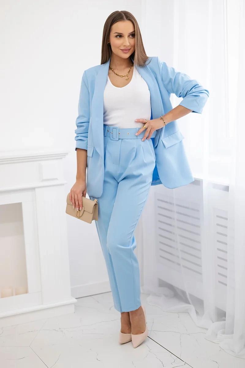 Elegantný set saka a nohavíc. Sako bez zapínania s prednými chlopňami s podšívkou. Nohavice s vreckami a opaskom. Vzadu na nohaviciach je všitá gumička.