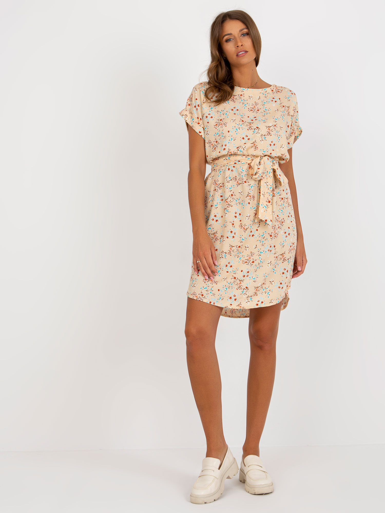 Vzorované šaty doplnené látkovým opaskom. Krátky rukáv. Pohodlný jednoduchý strih.