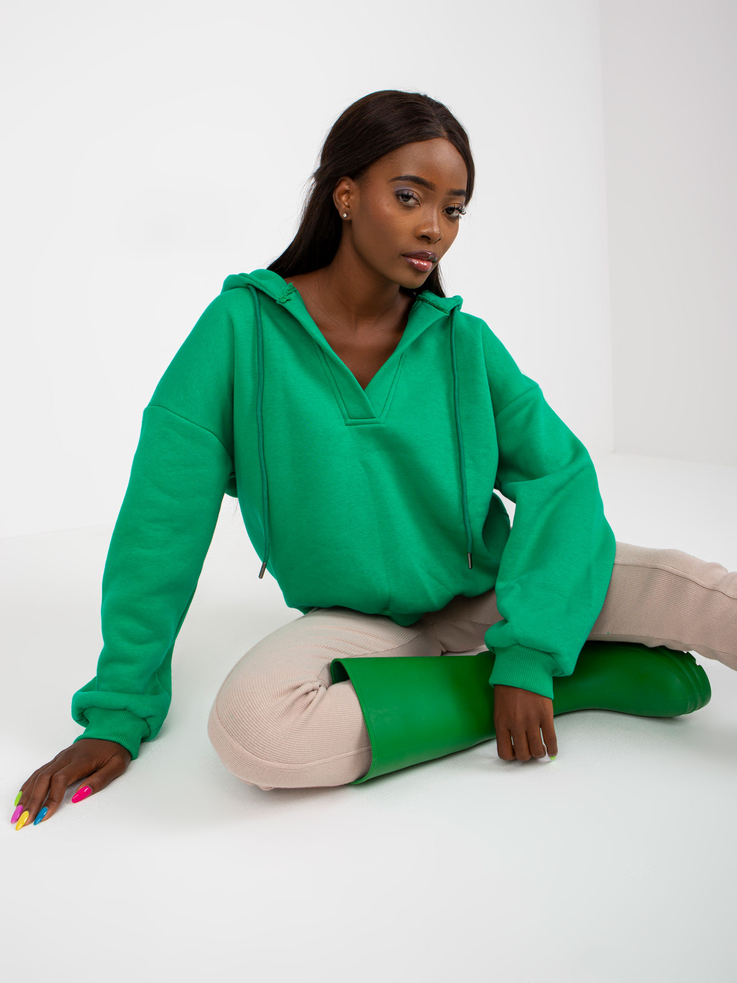 Dámska oversize mikina s výstrihom do V, s kapucňou. Mikina má krátky voľný strih.