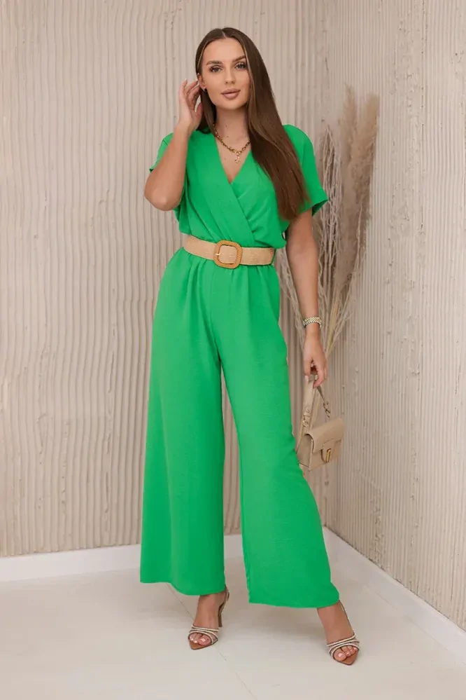 Dámsky overal s prekladaným výstrohom, doplnený opaskom.